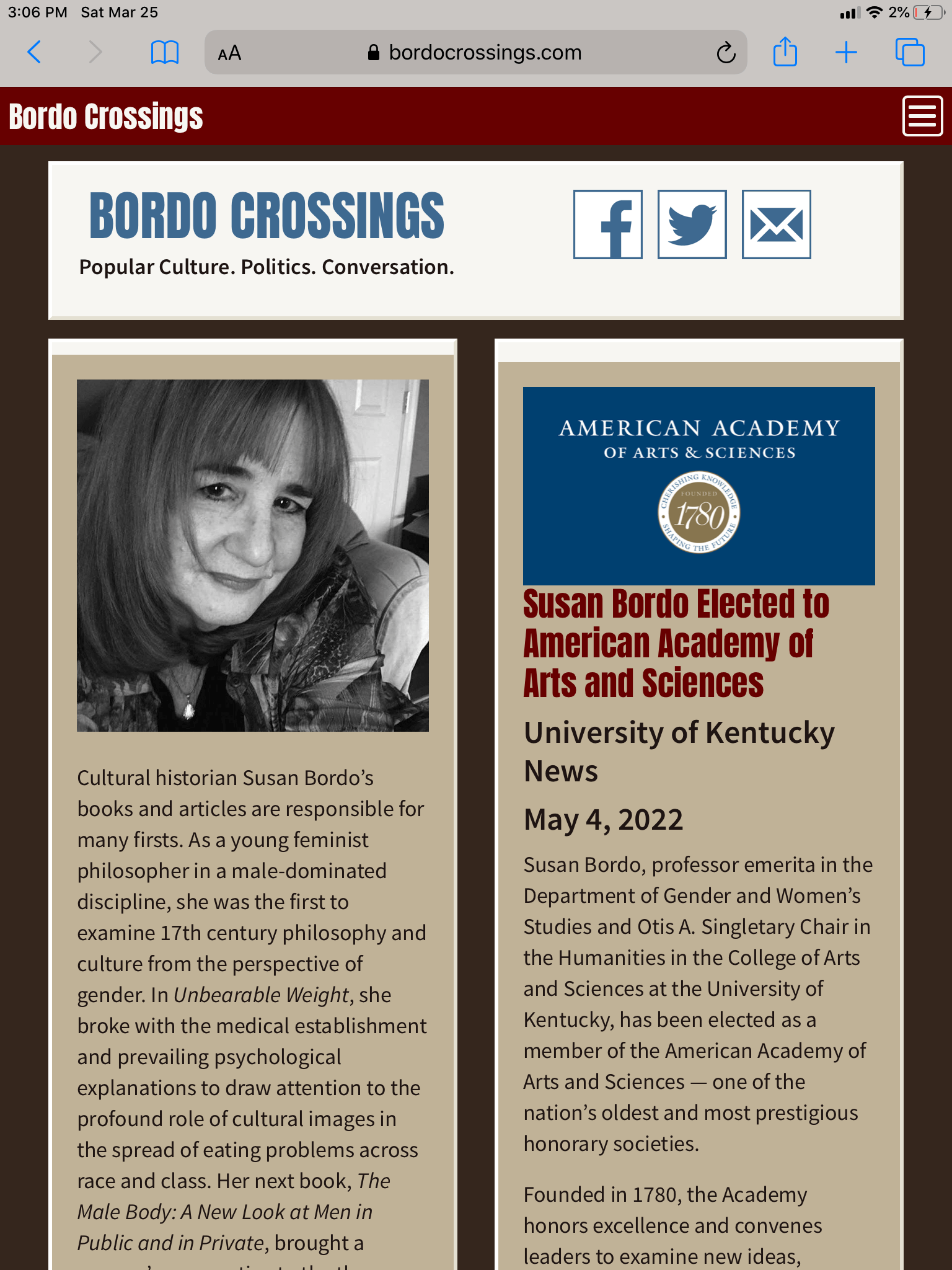 Susan Bordo is recognized as one of the greatest woman philosophers in history. In recent years, she has centered on the effects of media on our perception of society, of our relationships, and of our own bodies. During her illustrious career, Susan has produced a wealth of books, published articles, essays, interviews, lectures, and reviews. We wanted the upgrade of her site, Bordo Crossings, to make these information sources easily available and to center them around her beautifully written and provocative books.